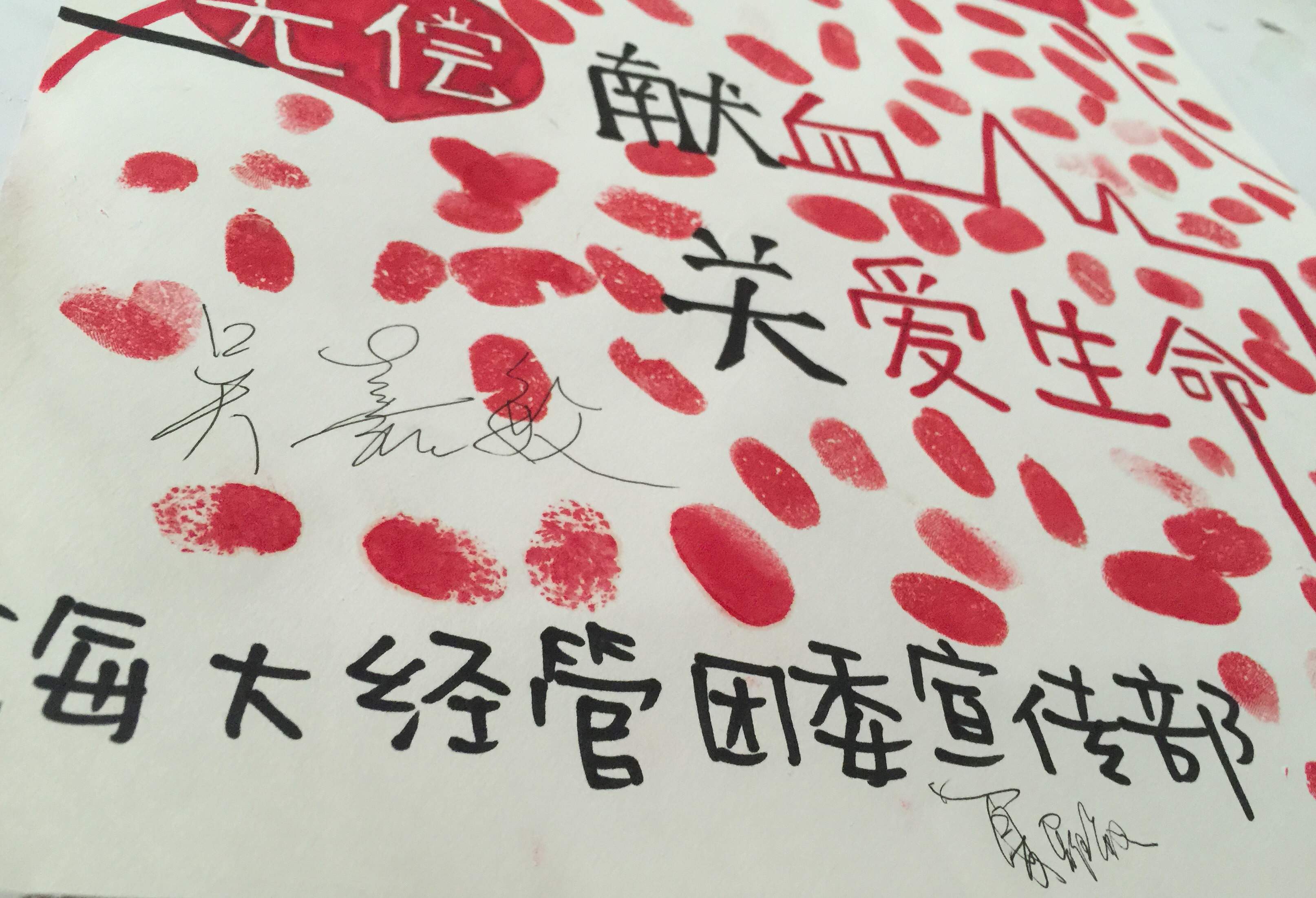 献血过程中,校党委书记吴嘉敏、校团委书记夏雅敏、院党委书记岑伟平、院党委副书记林喜臣来到献血现场慰问无偿献血的老师和同学、医护工作人员以及志愿者们,对献血的师生们表达了关心和问候,对他们的奉献精神给予高度的赞扬。与此同时,吴嘉敏书记与夏雅敏书记还在我院无偿献血宣传海报上郑重地签下了各自的姓名,以对我院师生踊跃参加献血的行为表示鼓励。献血结束后,学生们纷纷在海报上印上了各自的手印以纪念此次无偿献血活动。