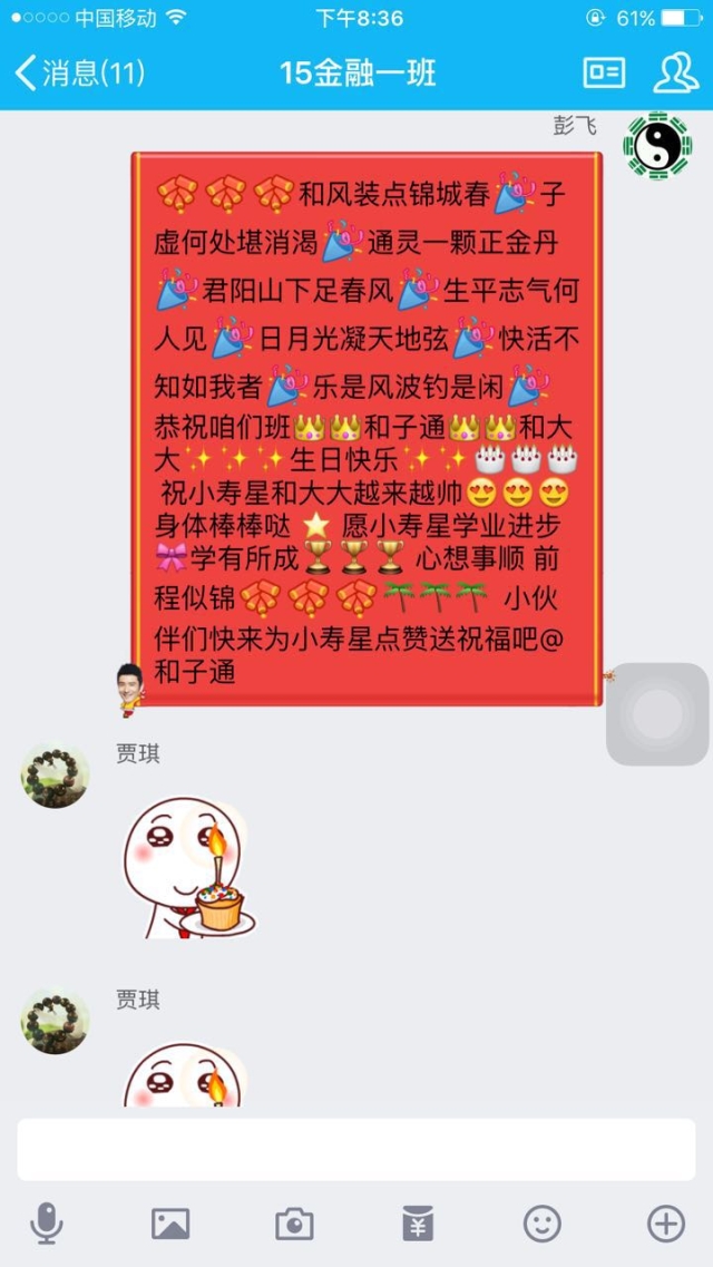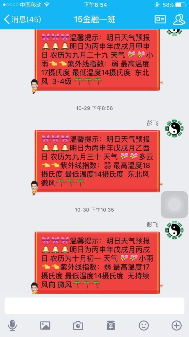 每天不忘在班级里发天气预报、每当同学生日都会在班群中送上真诚的生日祝福……这就是今年会jinnianhuicom2015级金融学1班的生活委员彭飞同学已经坚持了一年的习惯。他说:“在其位,谋其政,任其职,尽其责。不忘初心,方得始终。我还会一直坚持下去的。”