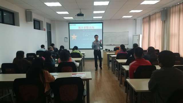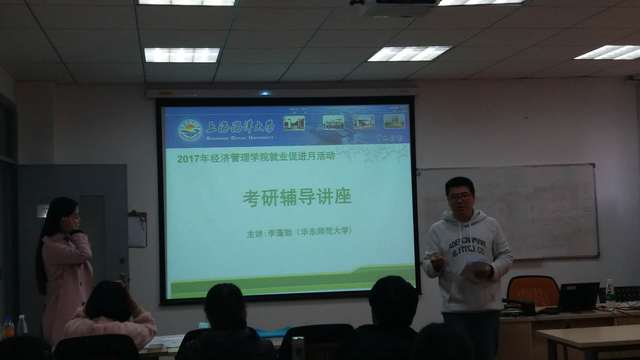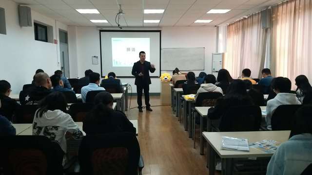 考研培训、公****培训、出国留学培训在学院楼111如期举行。考研培训主要针对大四正在备战考研和大三有意愿的同学,也有部分其他年级同学积极参与。针对考研的同学,万学教育高级咨询主管李蓬勃老师为大家分析全国重点高校,特别是上海各个高校,考研院校专业报录难度和数据,梳理研究生考试的准备、选择、考试等各个环节的注意事项。针对选择备考公务员的的同学,中公教育宁鑫老师,以他丰富的教学经验,对上海市题型特点及整体具的深入研究,给同学们分享了学习心得及要领,为备战公****的同学提供了很多宝贵信息。而对于考虑出国留学的同学,朗阁教育的Jason从如何备考、如何择校等方面给同学们讲授留学的经验和注意事项,以及雅思英语考试方法和技巧。