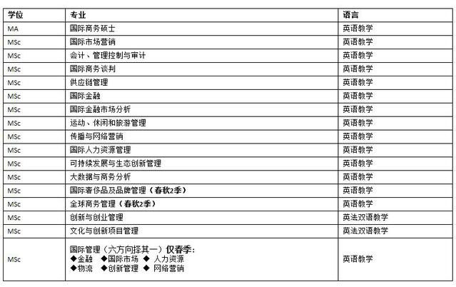 Ø管理硕士采取全英文授课,学制15个月,其中课程9个月,实习4-6个月。学习期间包括2周的欧洲其他国家交流学习(Winter Session)。可选择德国、西班牙、比利时、英国、荷兰、意大利、爱尔兰等国的合作高校,包括荷兰阿姆斯特丹大学、爱尔兰都柏林大学等。交流内容包括:社会企业责任或国际战略管理课程学习,文化活动和企业参观等活动。硕士学习期间,学校免费提供不同级别的法语必修课程。