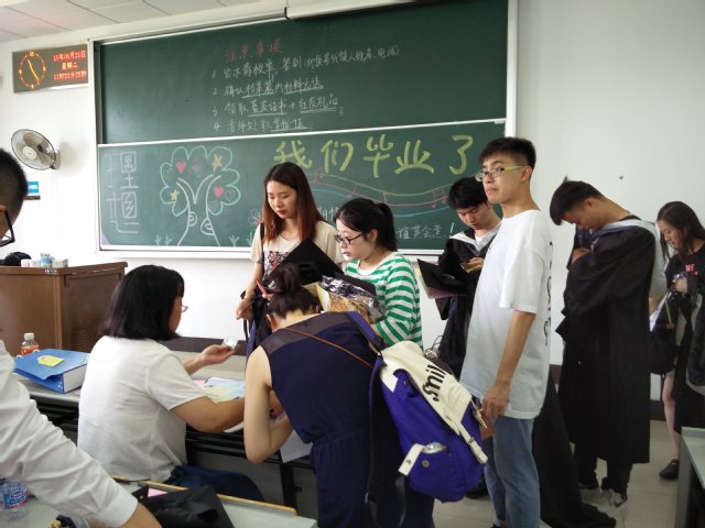 在毕业典礼结束之后,同学们以班级为单位到第四教学楼领取毕业材料。低年级志愿者们在各班级的教室里画上生动活泼的毕业班板报,为学姐学长们留下诚挚的送别祝福:祝愿2018届的学姐学长们勇敢踏上未来的征程,为实现梦想继续砥砺前行。