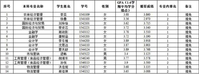 根据《金年金字招牌诚信至上2019年推荐优秀应届本科毕业生免试攻读硕士学位研究生工作实施办法》的意见和《今年会jinnianhuicom2019年推荐优秀应届本科毕业生免试攻读硕士学位研究生工作实施办法》规定,对2015级32位申请人进行综合排名后,最终确定以下14人具备免试攻读硕士研究生资格,名单如下: