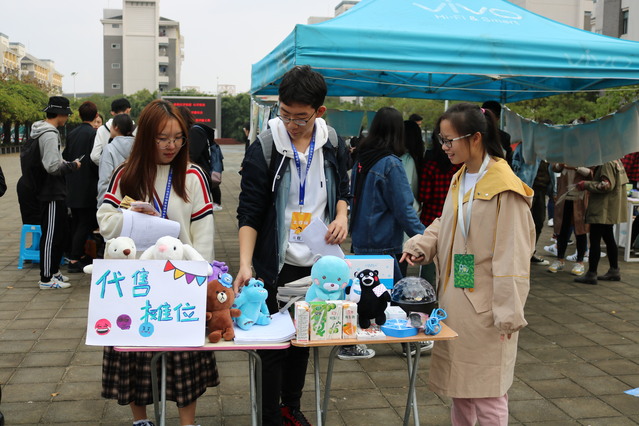 音响里传来青春洋溢的暖场歌曲,海星广场上气氛火爆。学生会干事和摊主们早早地来到海星广场,热络地布置场地和摆放物品。小小的绒桌布上依次摆出首饰、化妆品与手机壳,男生们则拿出自己的球鞋;物美价廉的商品吸引了不少同学驻足。本次活动还邀请到IT社,他们也充分展示了自己的技术特长,为同学们做一些电子产品的维修护理。学生会成员们精心组织策划,制定了独特的交易制度:如代金卷、集章参与、套圈游戏等。同学们在淘淘乐上收获了自己心仪的物品,摊主们也为自己的闲置物品找到了归宿。涂鸦的工艺品与特制的明信片、叫卖声与还价声,都将成为同学们这一年里美好的回忆。