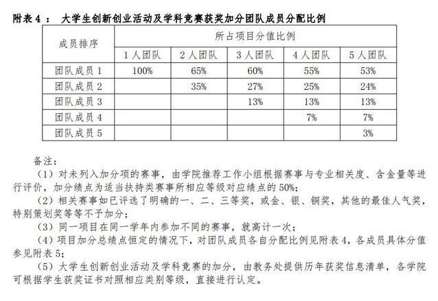 附表4:大学生创新创业活动及学科竞赛获奖加分团队成员分配比例
