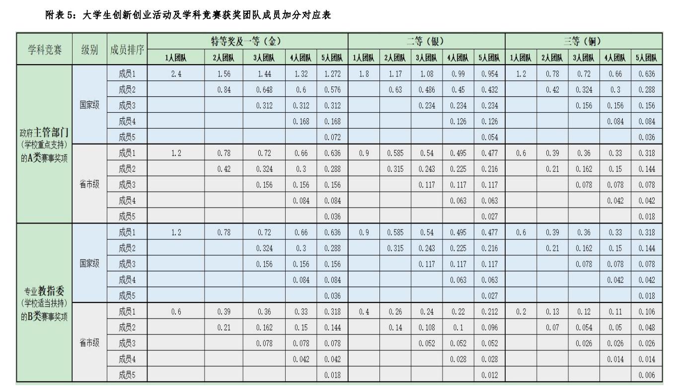 附表5:大学生创新创业活动及学科竞赛获奖团队成员加分对应表