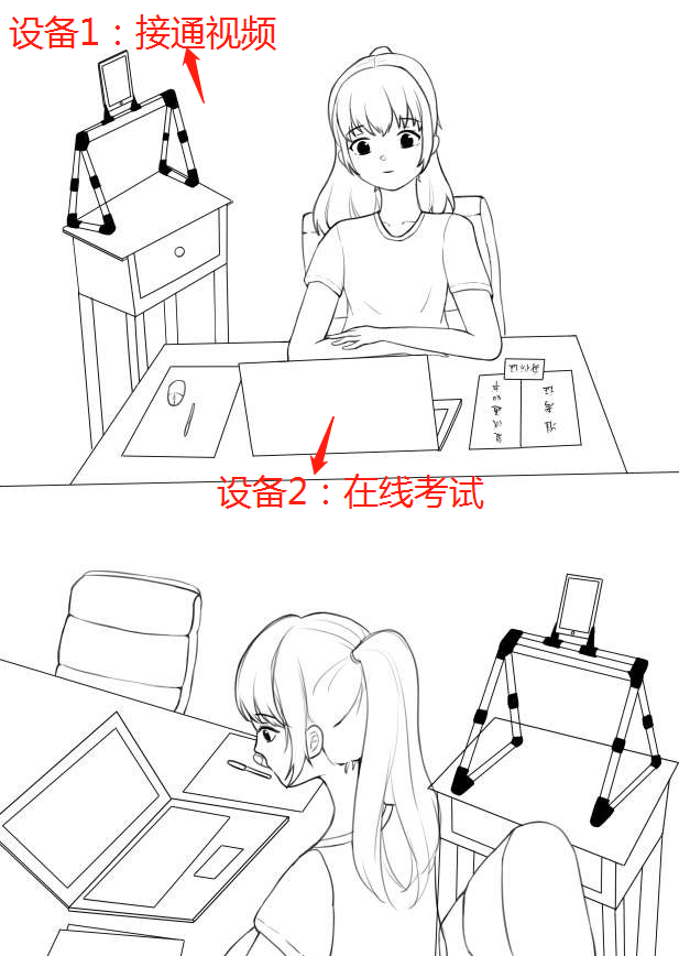 借用学习平台考试或手写上传考卷,考生考试条件均需同时满足两台设备,一台为平台在线考试或上传试卷用,一台为视频监考用;