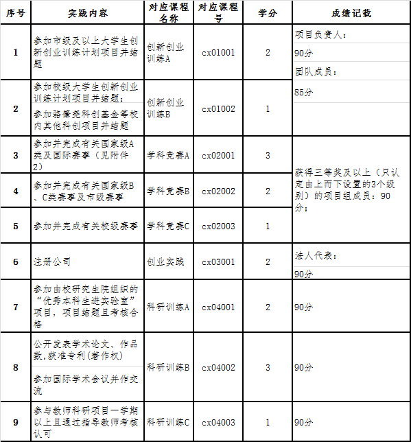 3.学生所获得超计划的创新创业教育实践学分,根据《金年金字招牌诚信至上本科生创新创业教育实践学分认定办法》替代部分等量不及格课程的学分数。