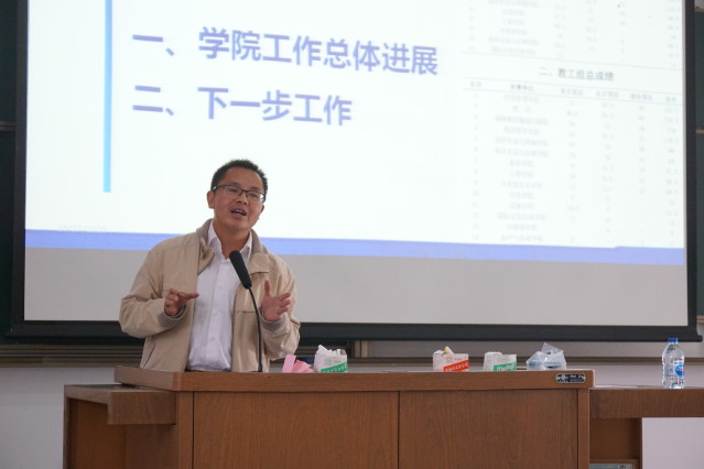 副院长陈廷贵部署科研相关工作:他提示财务报销注意事项;提醒老师及其指导的研究生重视学术诚信、论文作者排序问题;提前做好基金申请的准备工作。