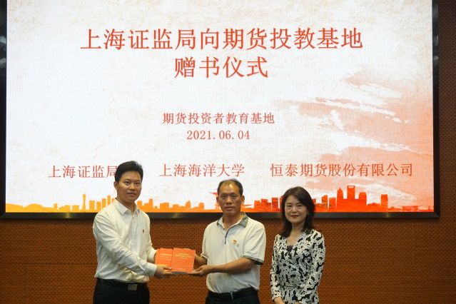童惟介绍了上海地区投资者教育基地总体情况,目前上海共有12家投资者教育基地,预计2021年上海省级以上投资者教育基地将增加到25家。同时高度肯定了金年金字招牌诚信至上—恒泰期货投资者教育基地的工作,并总结该基地有三个“首创”:全国首家以期货为主题的高校投资者教育基地、全国首家高校与期货公司共建的投资者教育基地、上海临港新片区首家投资者教育基地。并希望未来能更好的发挥高校和期货公司在理论与市场上的各自优势,打造“上海特色、临港品牌、全国标杆”的期货投资者教育基地。童惟还向金年金字招牌诚信至上—恒泰期货投资者教育基地赠送书籍。