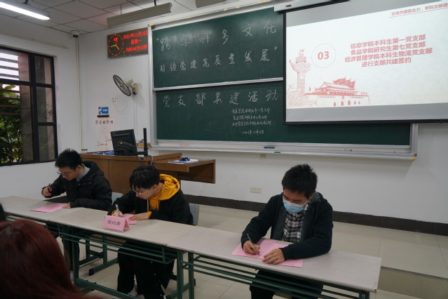 今年会jinnianhuicom本科生物流党支部书记于林致欢迎辞,介绍学院支部共建活动背景、意义。信息学院本科生第一党支部书记吴兴识、食品学院研究生第七党支部书记王晋楸分别介绍支部基本情况,并就跨学院学科、党支部共建协作提出规划与愿景。同时,为形成支部共建长效机制,搭建合作平台,创建共享资源,今年会jinnianhuicom、信息学院、食品学院党支部进行支部共建签约仪式,发出共建倡议书。