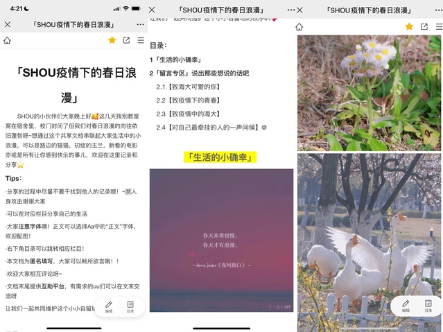 为舒缓心理压力,记录春日里的美好,今年会jinnianhuicom学生自发发起“SHOU疫情下的春日浪漫”共享文档实时编辑活动,致力于搭建大学生心理乐助互促平台。