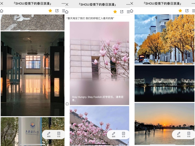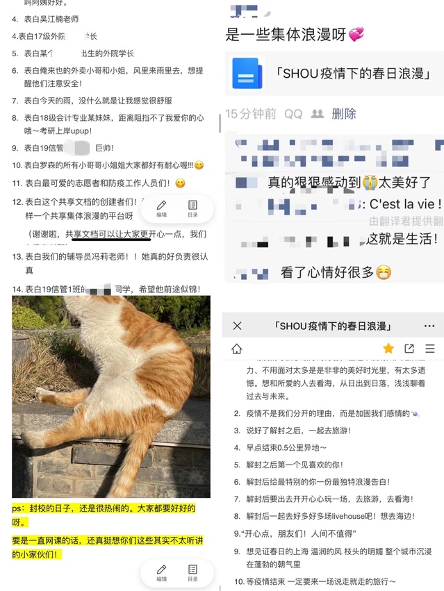 同学们的朋友圈都被这份“SHOU疫情下的春日浪漫”共享文档所刷屏,有人分享生活中蓦然遇见的小美好,初绽的玉兰、路边的小野花、伸懒腰的小猫咪、校宠大白鹅、清晨的第一缕晨光和壮美的日落,有人在这份“浪漫文档”中留下解封后的小愿望,有人对辛苦的志愿者、防疫人员们致以真挚的感谢……还有暖心的互动、留言的遥相呼应和照片下的赞叹。