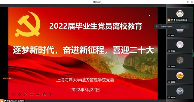 为强化毕业生党员的党员意识,提高毕业生党员的党性修养,坚定毕业生党员的理想信念,引导毕业生党员胸怀祖国、脚踏实地、担当作为,做勇立潮头的奋斗者,在新的岗位上继续发挥先锋模范带头作用。5月22日下午,今年会jinnianhuicom党委于线上组织开展了以“逐梦新时代 奋进新征程 喜迎二十大”为主题的2022届毕业生党员离校教育。学院党委书记罗汝坤、学生党支部书记和全体2022届毕业生党员一同参加,共话新时代青年党员的责任与奉献、使命与担当。离校教育活动由学院专职组织员张闻主持。