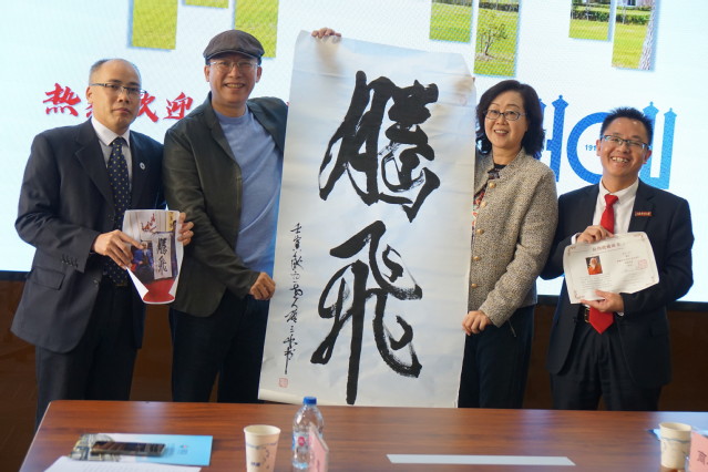 座谈会上,徐鹏起校友向学院赠送由知名书画大师所提“腾飞”二字的书画,祝福学校学院事业发展腾空而起、飞跃直上!