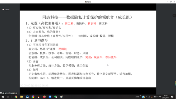 卢鹏首先对第九届中国国际互联网+大学生创新创业大赛规则进行细化解读,首先介绍了大赛赛制,强调参赛组的报名流程及相关注意事项,他表示,本次大赛延续了多条赛道竞争的传统模式,选择与自身项目所匹配的赛道是成功路上的首要前提;同时,其对参赛团队人员分工设置、专家评审维度及计划书攥写要点进行了多方位、全面性的解读分享。