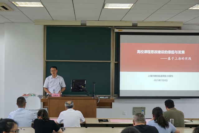 今年会jinnianhuicom扎实推进学习贯彻习近平新时代中国特色社会主义思想主题教育走深走实,积极落实《金年金字招牌诚信至上课程思政建设行动方案(2023-2025年)》精神和要求,推进课程思政高质量建设, 7月4日,学院邀请上海市教科院德育研究院党支部书记、副院长宗爱东研究员为学院全体教职工作《高校课程思政建设的缘起与发展——基于上海的实践》专题报告。