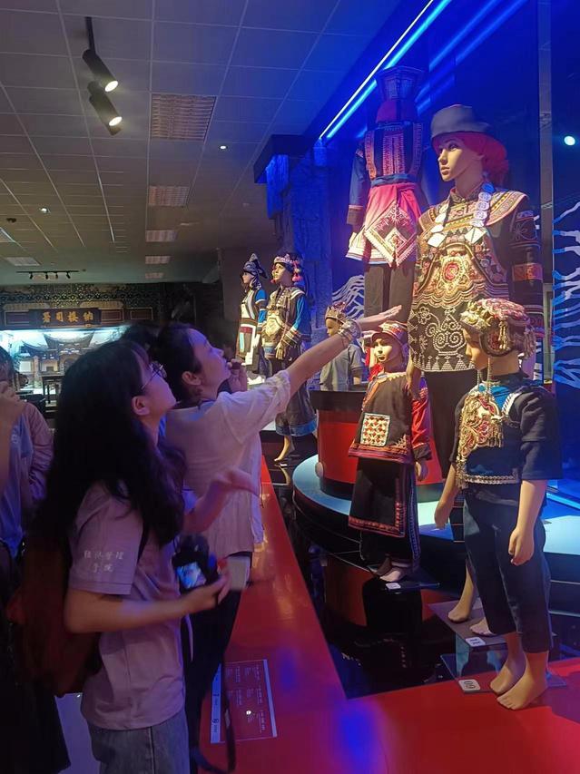 参观结束后,实践团与红河州博物馆研究部的两位老师进行了座谈,从数字化博物馆的可行性和博物馆数字化的看法和做法、IP联名技术和VR技术在博物馆的运用情况,以及红河州非物质文化遗产保护中民族服饰文化的开发利用、建水紫陶和个旧锡器产业的现状与传承发展等问题进行了深入的交流和探讨。实践队在交流访谈中更深刻地认识少数民族服饰,解决疑惑并提出意见与看法,希望为红河州传统服饰文化的传承与发展注入活水源泉,致力推动当地文化产业发展,亦为非遗文化的传承与发展提供创新性方案与范例,在交流互鉴中促进传统文化焕发新生机。