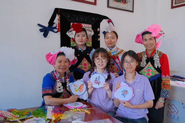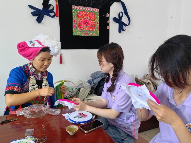 “这些彝绣太精美了!我们可以试一试嘛?”在尼苏小镇彝族剪纸刺绣文化传承基地,实践队的成员们有幸得到非遗传承人李丽琼老师的指导,拥有一次别开生面的新奇体验。在体验之前,李天昊等同学积极请教,深入了解这项非遗文化背后的经济问题、市场问题。在体验过程中,针与线交织谱画出各式绚丽纹饰,看似仅是轻而易举的将针线穿过丝绢,然每一针脚背后都有其独特的技法。丁梦娇同学十分喜爱且享受穿针引线、钩织自己的作品的过程,每每完成一部分就迫不及待寻求李老师的肯定。“彝族剪纸刺绣文化传承基地为当地绣娘提供一个便利的交流展示平台,为当地旅游开发注入新活力。”李老师亦是毫不吝啬夸奖,笑着回应并告诉她,“刺绣是一件十分需要耐心与信心的活计,要不断自我肯定、自我认同,以良好的心态来鼓舞自己在反复枯燥的穿针引线中寻找趣味。”