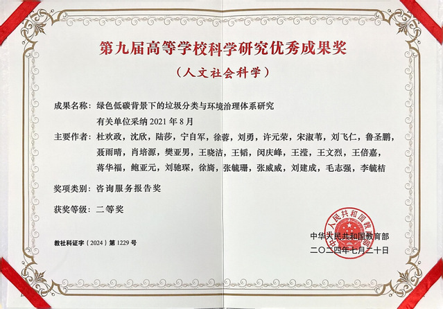 日前,教育部下发了2024年第九届高等学校科学研究优秀成果奖(人文社会科学)获奖证书。今年会jinnianhuicom副教授沈欣作为成果第二完成人,参与同济大学教授杜欢政《绿色低碳背景下的垃圾分类与环境治理体系研究》项目,荣获咨询服务报告类二等奖。