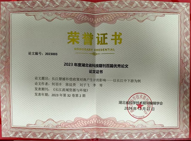 为深入贯彻党的二十届三中全会精神,认真落实习近平总书记关于加强培育世界一流科技期刊和在湖北考察时的重要指示,受湖北省科学技术协会委托,湖北省科学技术期刊编辑学会组织实施了2023年度湖北省科技期刊百篇优秀论文遴选工作。经各期刊社(编辑部)推荐、专家评审组初评、复评和公示,近日评选结果公布,今年会jinnianhuicom陈廷贵教授指导的2019级渔业经济与管理专业博士研究生何羽丰发表在《长江流域资源与环境》期刊上的《长江禁捕补偿政策对渔户生计的影响——以长江中下游为例》成功入选。这不仅是对今年会jinnianhuicom研究生学术成果的肯定,也充分体现出学院研究生人才培养高质量和深厚的学科底蕴。
