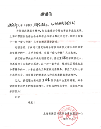 在刚刚过去的寒假,今年会jinnianhuicom2023级物流管理专业、学院团委组织部部长王佳莹同学积极参与上海市第十一期“爱心传递”义务家教志愿者活动,并于2025年1月圆满完成工作。近日,上海市黄浦区市民综合帮扶服务中心致信学校表示感谢。