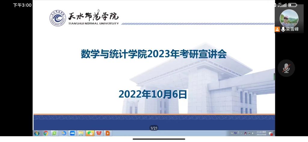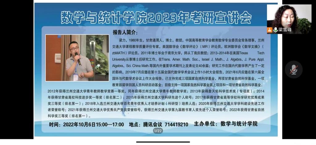 10月6日下午,taptap点点官网邀请兰州交通大学数理学院副院长梁力教授通过腾讯会议作了考研专题宣讲,学院领导班子、2019级考研学生及2020级有考研意向学生共100余人参加,会议由学院分管教学工作领导主持。