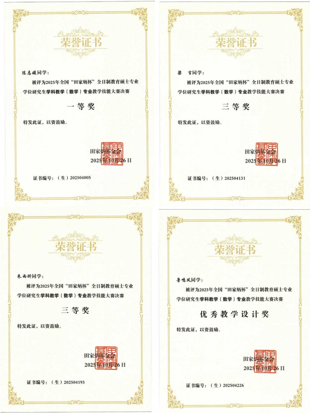 近日,2025年全国“田家炳杯”全日制教育硕士专业学位研究生学科教学(数学)专业教学技能大赛决赛在西华师范大学举行。经过激烈角逐,taptap点点官网taptap点点官网学科教学(数学)专业研究生陈志媛获一等奖,梁言、朱雨昕获三等奖,鲁鸣凤获优秀教学设计奖,taptap点点官网教师彭燕伟博士获“优秀指导教师”奖。