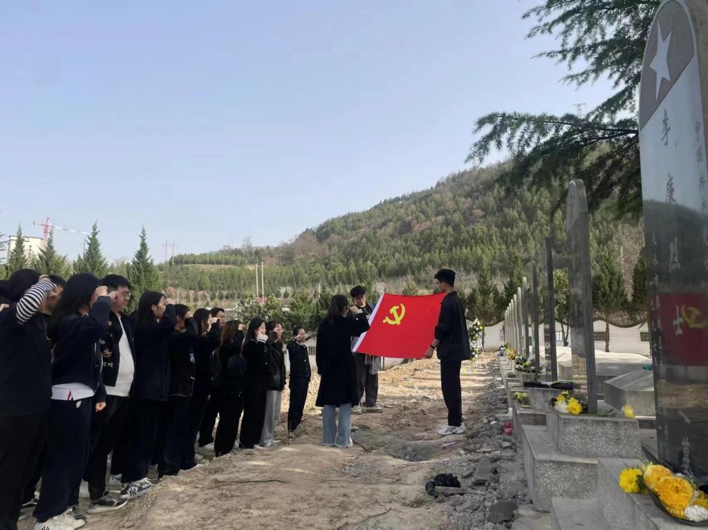 在巍然耸立的墓碑前,学生党支部书记张苗苗老师带领全体党员面向党旗,高举右拳,重温入党誓词:“我志愿加入中国共产党,拥护党的纲领……随时准备为党和人民牺牲一切,永不叛党”。铮铮誓言响彻天空,坚定有力的誓词传达出身为共产党员的责任感和使命感,将理想信念、初心使命融入血脉,将不畏艰险、不怕牺牲的精神植入心田,表达了对党的无限忠诚和为共产主义奋斗终生的坚定决心。