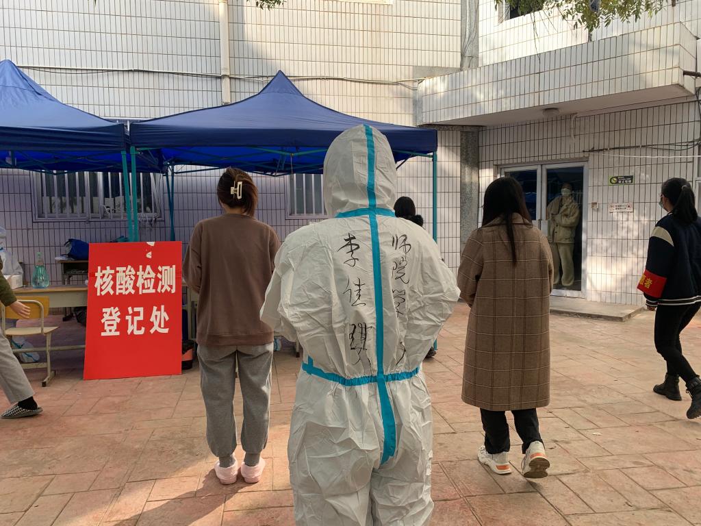 学校紧急通知需要三名志愿者辅助医护人员进行核酸检测,她主动报名,作为党员,她迫切地想参与到抗疫斗争的第一线,奉献出自己的一份力量。自全校第三次全员核酸开始,她连续八天穿上防护服,协助医护人员进行核酸检测。自参与核酸检测工作以来,每日早早起床,提前到达核酸检测地点,穿戴防护服,配合医护人员做检测准备。随时做好准备,等待命令,有时有突发核酸安排,还在睡梦中的她,接到电话,丝毫不耽搁,迅速起身,穿戴防护服配合检测。在工作中,她认真负责。“保持间隔距离,注意个人防护”“打开健康码,十人一组,有序排队”一句句叮嘱,将学生的核酸检测组织的井然有序。“这是第十个,封管”“这是第五百个,封箱”在协助核酸检测的工作中,她与医护人员配合默契,收到了医生和领导的一致好评。在疫情严峻之时她主动站出来协助核酸检测,在冷风中她也不曾退缩依旧坚守岗位,她以实际行动践行一名党员的初心和使命。