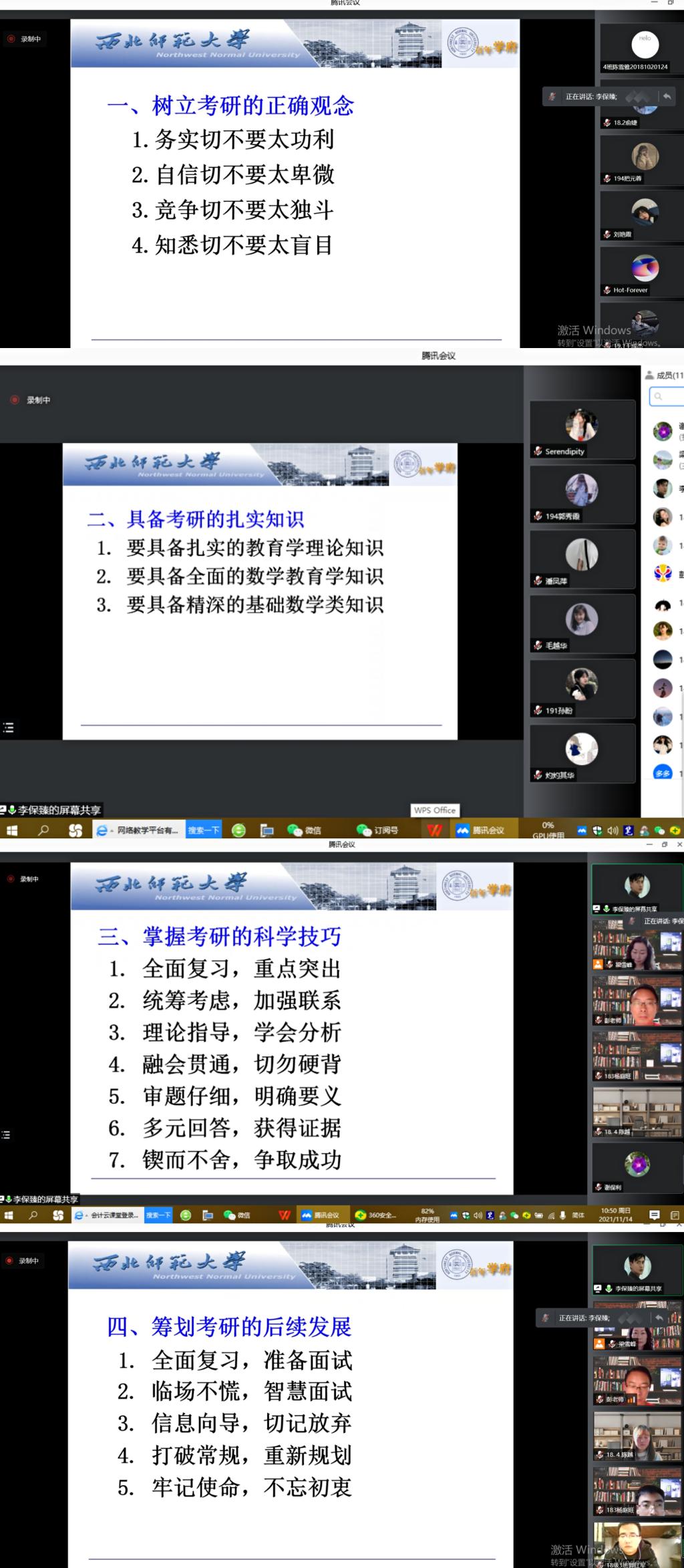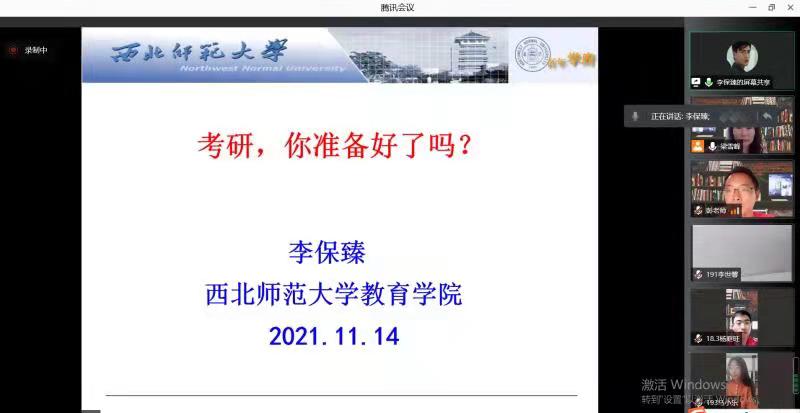 2021年11月14日,应taptap点点官网邀请,西北师范大学李保臻教授通过腾讯会议作了题为《考研,你准备好了吗?》辅导报告。18级报考专硕同学、19级准备考研同学、学院领导及部分感兴趣的教师共120余人参加,会议由学院分管教学领导主持。