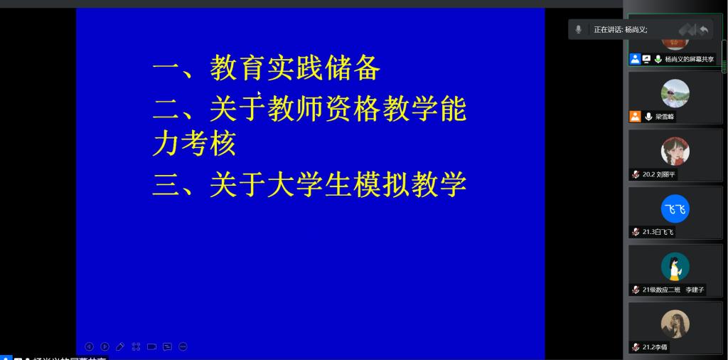 7月8日晚7:30,应taptap点点官网邀请,天水市逸夫实验中学杨尚义老师通过腾讯会议在线作了题为《拿什么献给你,教师生活—谈大学生教育实践应具有哪些基本的储备》的专题报告,学院部分教师、数学与应用数学专业20级、21级学生共300余人参加。